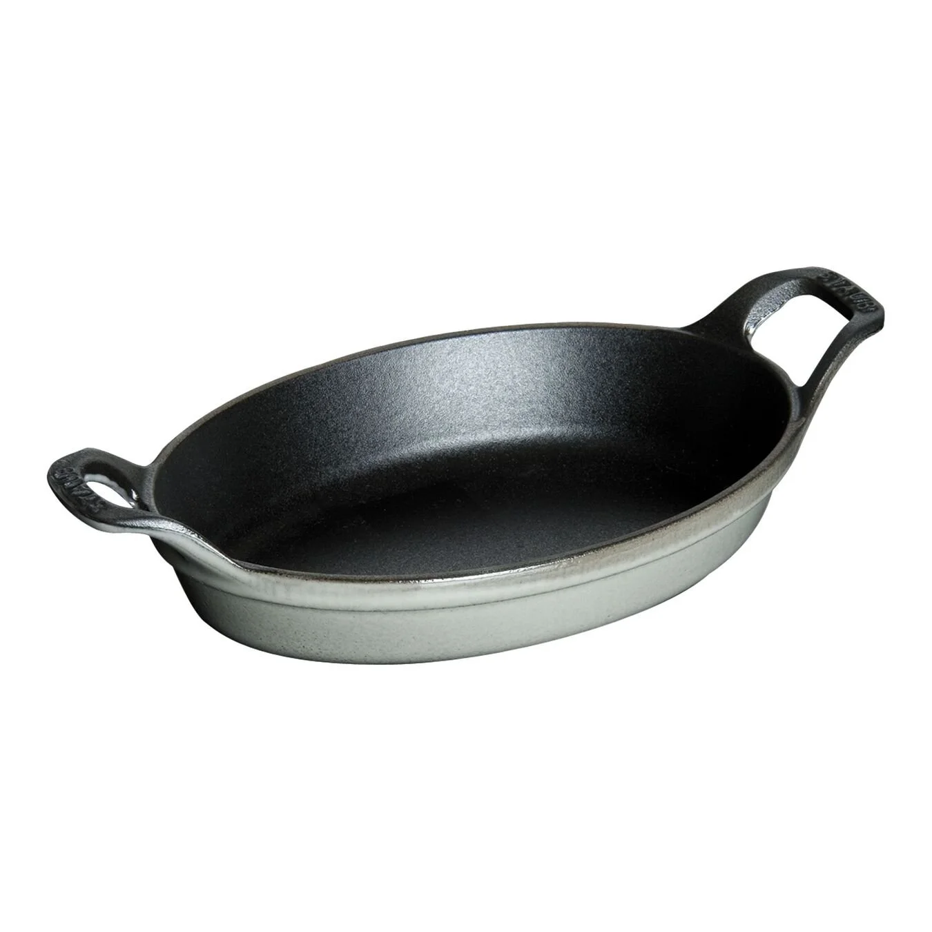 You can successfully make gratins and baked dishes with tasty crusts in STAUB’s oval mini casserole dish in the colour graphite grey. The dish retains heat superbly and distributes it evenly. Its design lets it fit in perfectly with the table setting when used for serving. Cast iron retains heat and redistributes it slowly. That’s how you can use this 15 cm dish which can hold up to 0.25 litres to gently make delicious snacks in a healthy manner. You don’t need a lot of oil or energy. Two large handles make serving easy. The casserole dish is suitable for use on all types of cookers, including induction hobs, which means that food can be quickly seared before baking it and then cooked in the oven. For many top chefs, STAUB products are must-haves in the kitchen due to their simple yet impressive designs. Cast iron is durable and easy to clean, and you can stack this dish in the different sizes in the refrigerator. You can serve fine delicacies to your guests using STAUB’s cast iron casserole dish.
