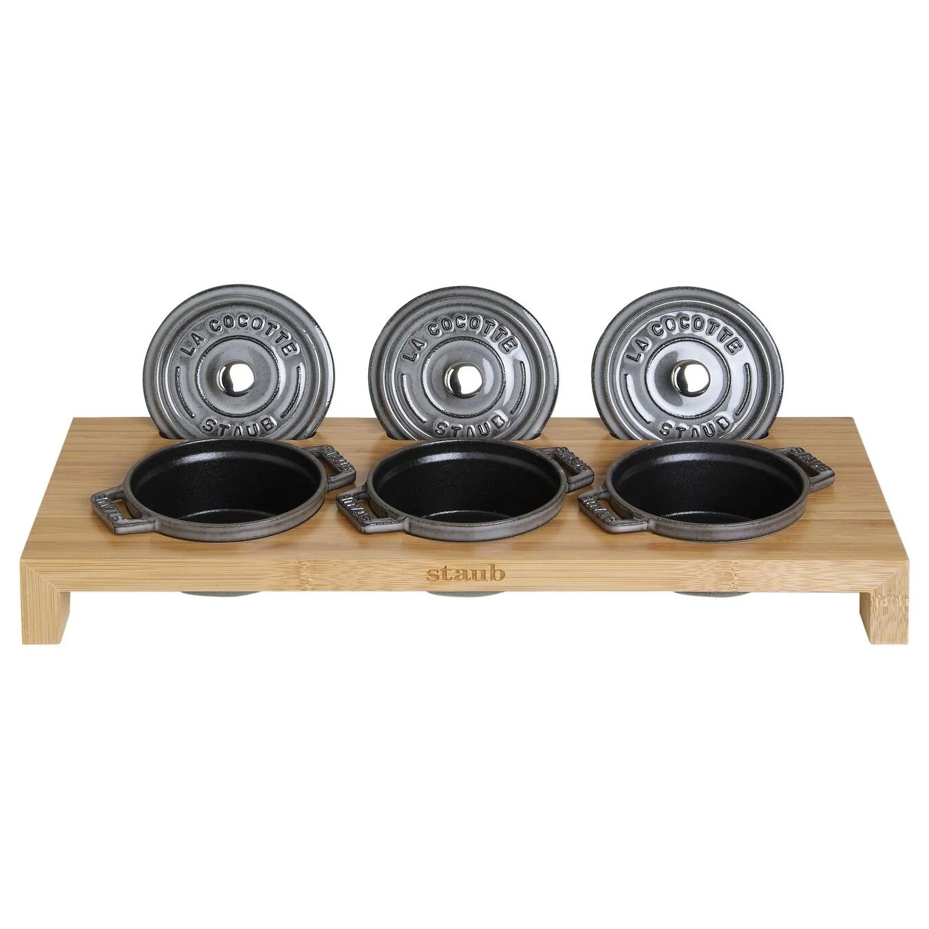 A cocotte is a small casserole dish in which you can prepare and serve ragouts, gratins and other dishes. The serving board from STAUB allows you to deliver mini cocottes direct to the table. The serving board for three mini cocottes measures 42 x 16 cm in size, is rectangular and has little feet to stop the hot part of the dish from touching the table. The product features a high-quality bamboo design. You can comfortably and elegantly present your mini cocottes using the serving board.
