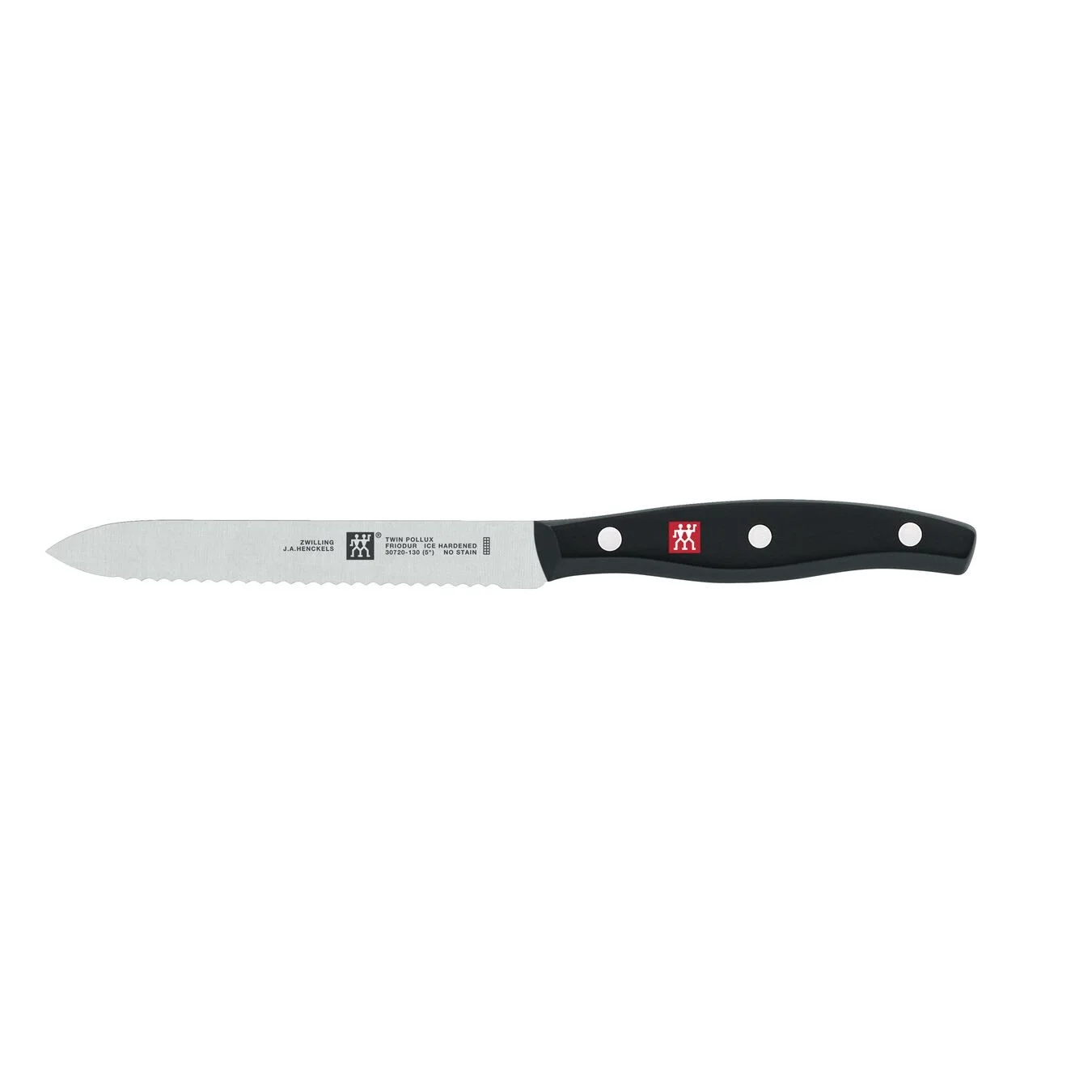 Makes (kitchen) life easier. The ZWILLING TWIN Pollux utility knife is a reliable companion and all-rounder when it comes to cutting cheese, ham, sausage or baguette into cubes or slices in the kitchen, for example. It works just as well with tomatoes, peaches, apricots or softer cheeses such as mozzarella and hard skins like on a pineapple. The serrated stainless steel blade effortlessly cuts everything evenly as thick or thin as you like. The stamped knife is characterised not only by the special choice of material, but also by its workmanship. The corrosion-resistant ZWILLING special formula steel impresses with its balance of chrome and carbon and ensures high resistance. The finishing of the 13 cm blade with a special ice-hardening also contributes to the long service life of the utility knife. The ergonomically designed handle made of high-quality plastic in the typical three-rivet design with ZWILLING logo in red is just as perfectly balanced.