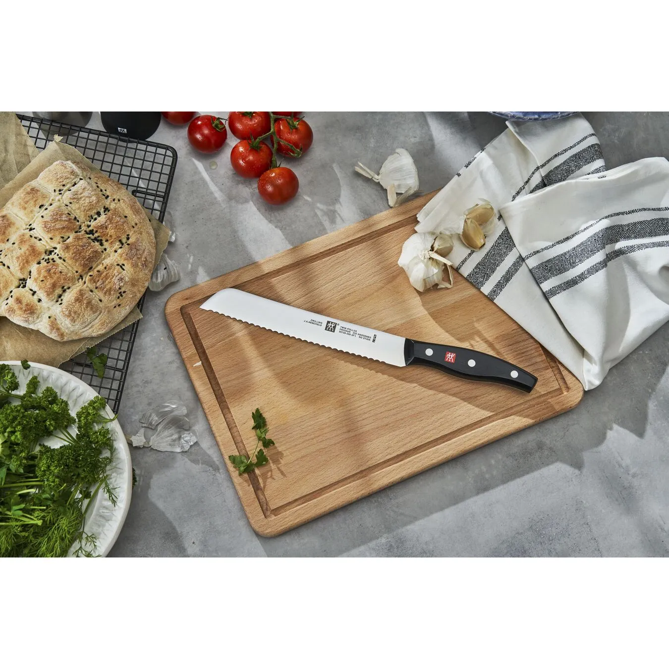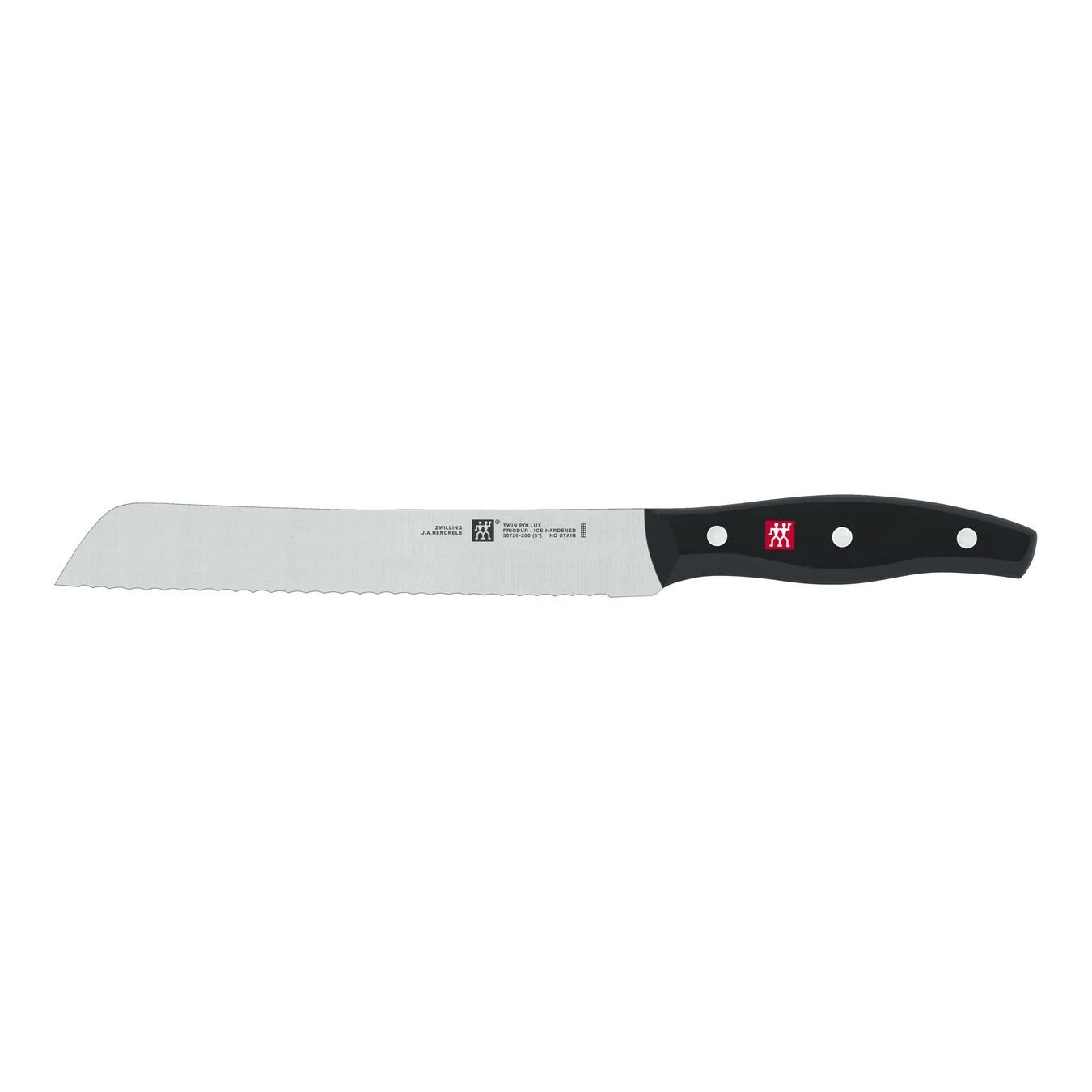 Crispy bread, fresh rolls. Most people can’t imagine a cosy breakfast without these ingredients. The bread knife from the ZWILLING Twin Pollux series is therefore the perfect partner. Thanks to the serrated edge, the 20cm long blade effortlessly cuts even firm crusts while leaving the soft, delicious bread roll inside intact. The bread knife can also be used to cut Sunday roasts or to cut fruit and vegetables with a hard shell and soft inside such as melons or pumpkins. The light weight of the bread knife means that it sits comfortably in the hand when cutting. The bread knife is also perfectly balanced so that it sits perfectly in the hand with its curved handle made of easy-care plastic in a three-rivet design. The ice-hardened FRIODUR blade is made of ZWILLING special formula steel. The ZWILLING logo in red rounds off the timeless design of the knife.