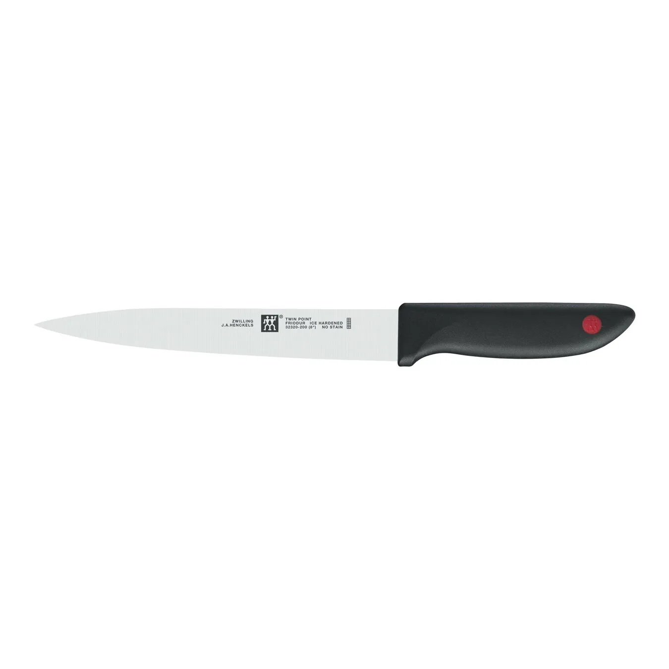 This 20cm slicing knife will help you to cut raw, cooked or roasted meat into equal chunks. The fundamental shape of the knife is oriented around its sharp blade and compact handle. This TWIN® Point knife will fulfil the very highest demands and can be manoeuvred accurately and securely. The slightly rounded plastic handle features a distinctive ZWILLING logo inside a red dot and the knife has a smooth cutting edge and pointed blade. This pointed, ice-hardened FRIODUR® blade makes the knife exceptionally resistant to corrosion, whilst the ZWILLING special formula steel is made from an impressive balance of carbon and chrome. The knife is embossed and suitably lightweight, a feature which, when combined with a non-slip handle, makes the knife easier to handle when preparing meat before or after cooking. This high-quality, slim slicing knife will help you cut through meat cleanly and in a straight line, whether you are working in the kitchen or serving up food at the table.