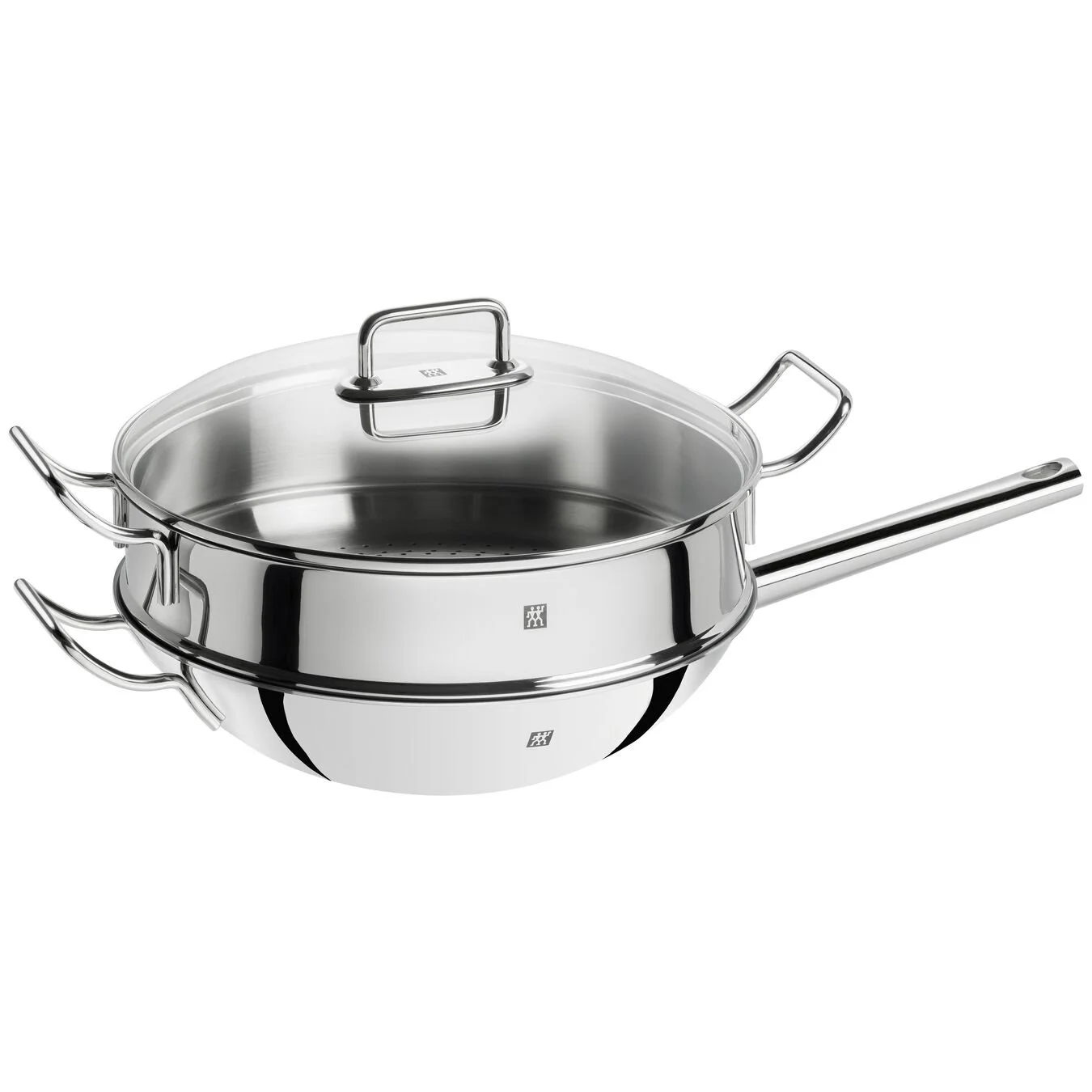 Steaming is a gentle technique usually used to cook vegetables. Steaming helps vegetables retain their shape, colour and flavour and since food does not come into contact with water, it is also a better way of preserving essential vitamins. This steamer insert for the 32 cm ZWILLING® Plus wok is made from stainless steel and has a high-gloss finish and handles. Since the handles stay cool as you cook, the insert can be easily removed from the wok at any time. Fill your wok with water or vegetable stock and place vegetables or other food into the steamer insert. A lid can be used to stop heat or steam from escaping. This steamer insert can also be used in Asian cuisine to prepare fish, meat or noodles. The stainless steel warms the food up gently so that vegetables retain their natural flavour. Steaming is also a healthy way of cooking as no fat is required. The insert is also very easy to clean after use as its smooth surface is easy to care for and dishwasher safe. With the ZWILLING® Plus steamer insert, healthy food, including fish and vegetables, can be prepared in an instant while locking in the vitamins: no kitchen is complete without one. Please note wok is not included.