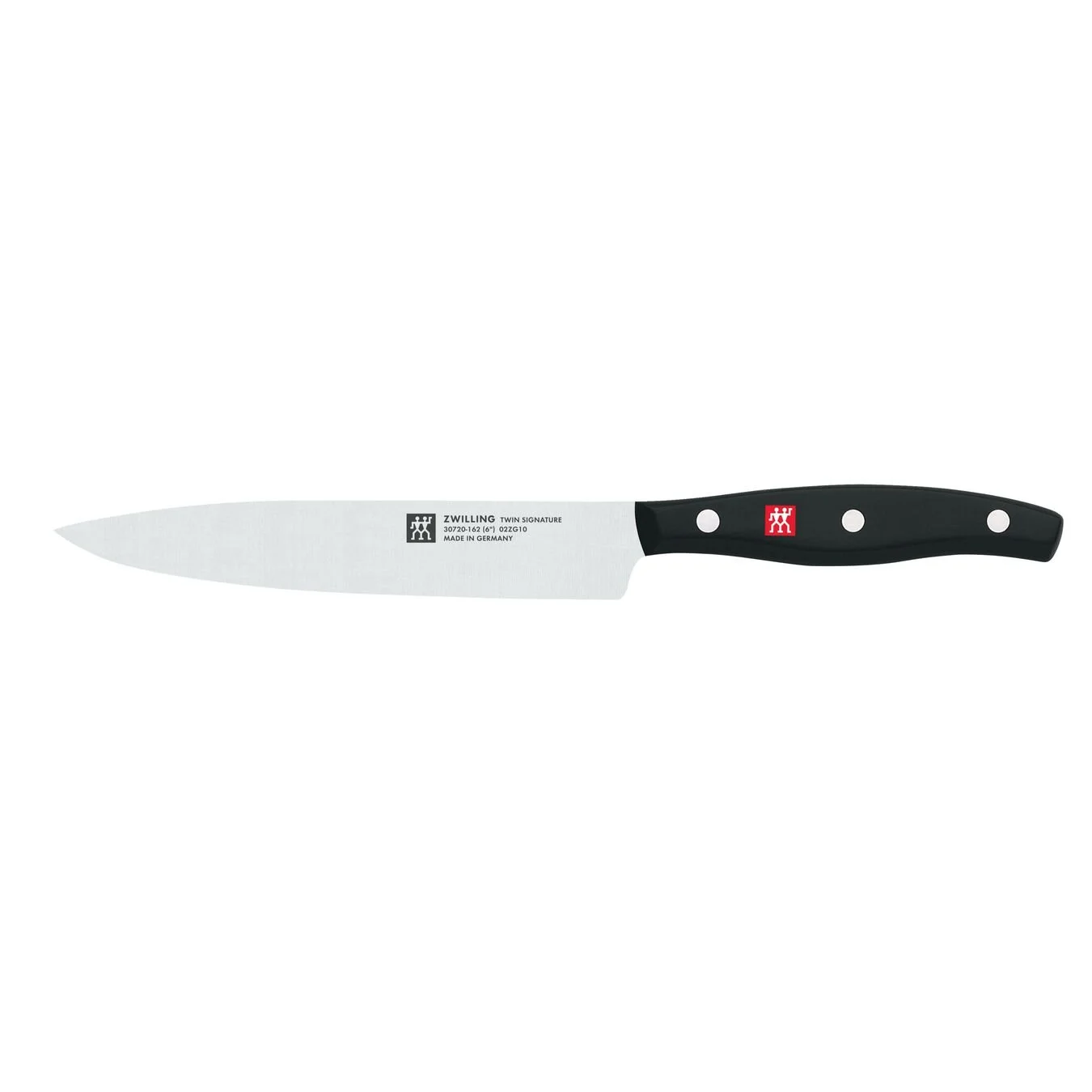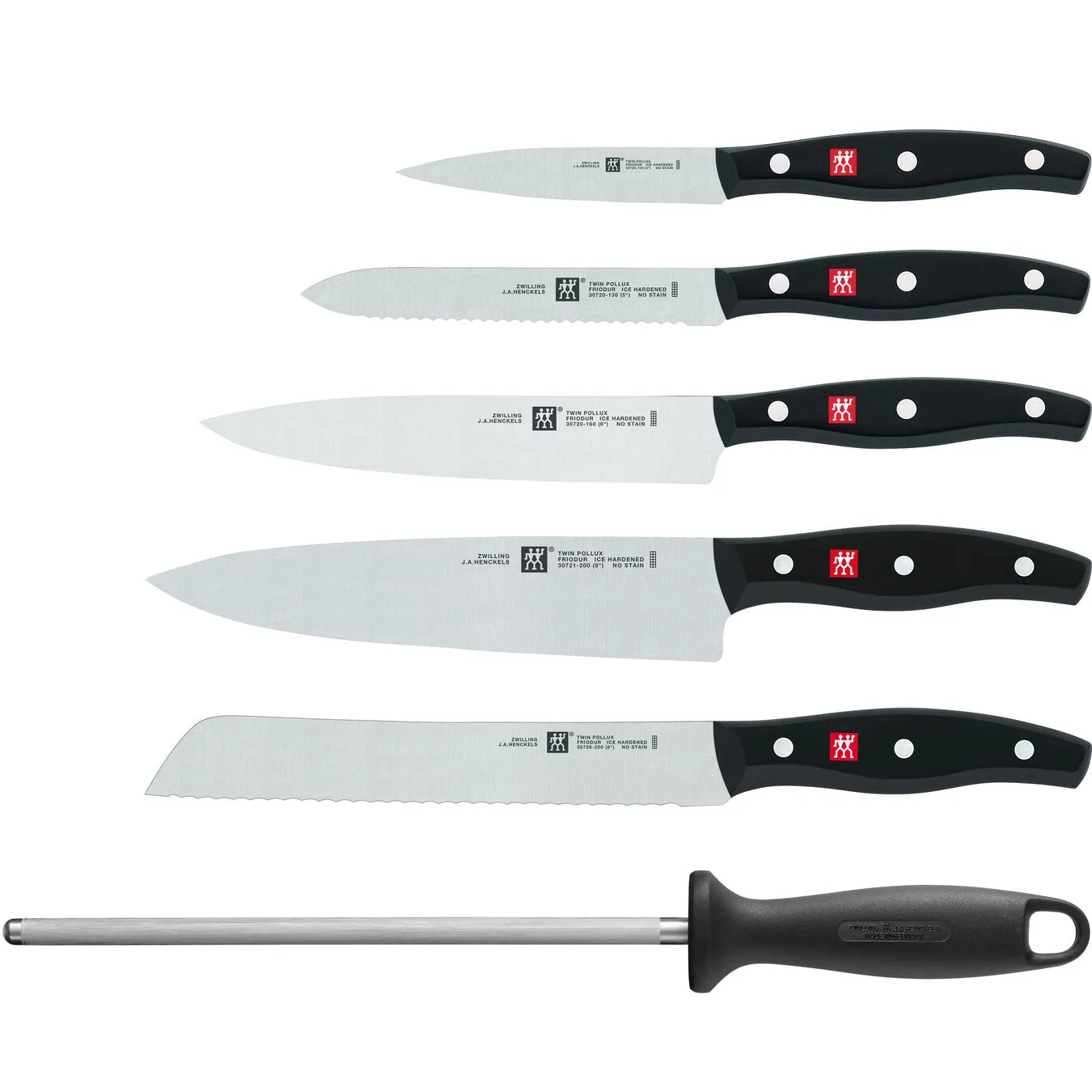 It offers a garnishing knife, a utility knife, a carving knife, a chef’s knife and a bread knife from the Twin Pollux series. The selection of knives is well suited for amateur cooks and beginners who want to have the right knife at hand for the usual cutting work while cooking. A sharpening steel with a plastic handle is also included, which can be used to sharpen the knives themselves.